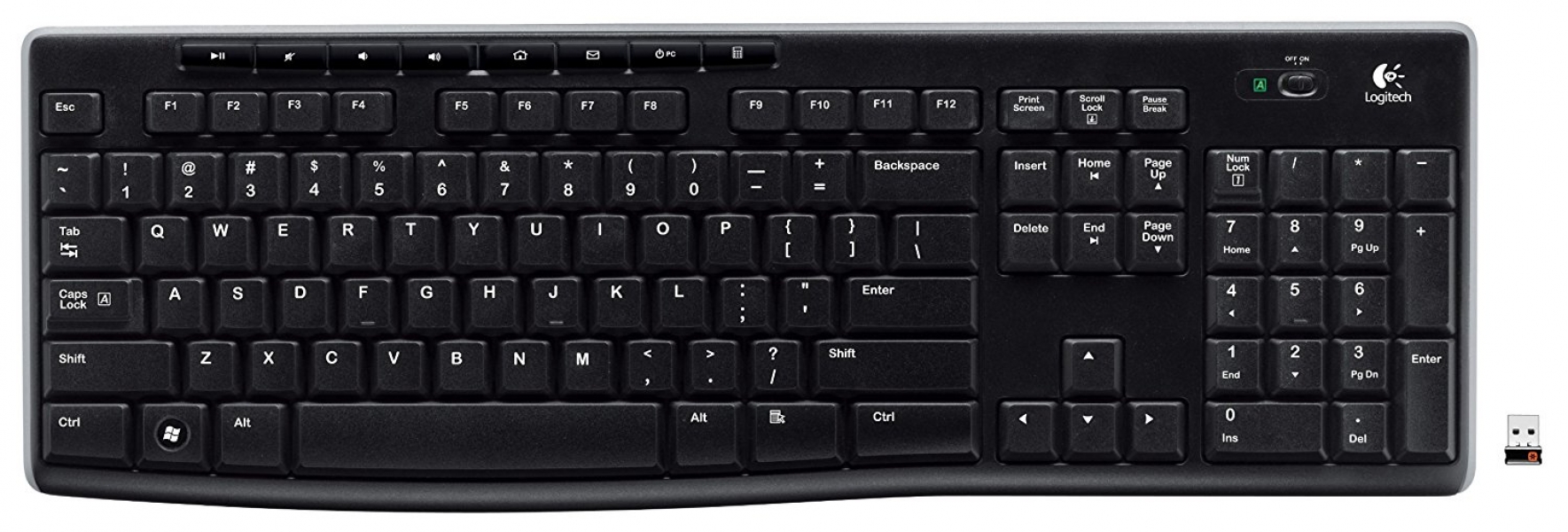 Bàn phím Logitech K270 Full-size có 104 phím. Ngoài ra còn có thêm 1 hàng phím chức năng gồm 8 phím giúp bạn thao tác mở/tắt nhạc, mở calculator,… nhanh chóng.