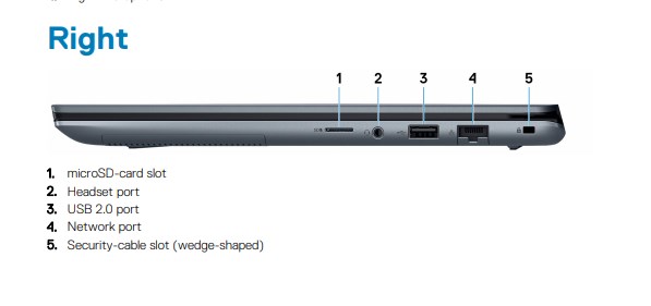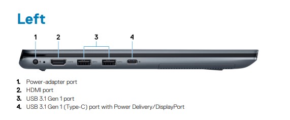 Laptop Dell được trang bị đầy đủ các cổng kết nối phổ biến như: 2 x USB 3.1 Gen 1 ports, 1 x USB 2.0 port, 1 x USB 3.1 Gen 1 (Type-C) port with DisplayPort/ PowerShare, 1 x Universal headset jack, MicroSD card reader